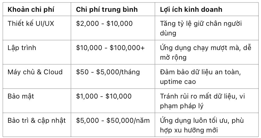 Nhìn vào bảng trên, bạn có thể thấy rằng chi phí phát triển ứng dụng không phải là chi phí mà là khoản đầu tư dài hạn.